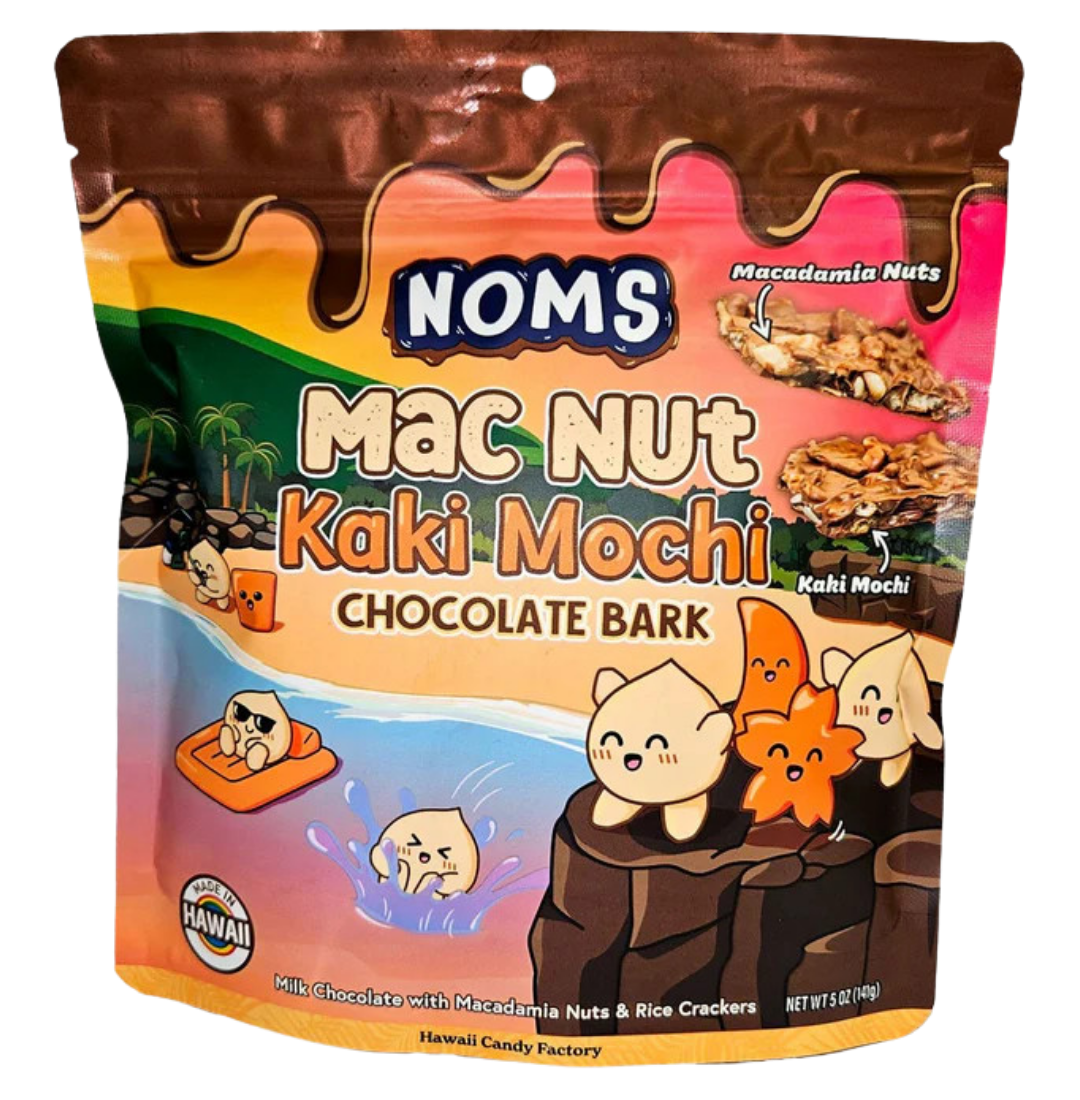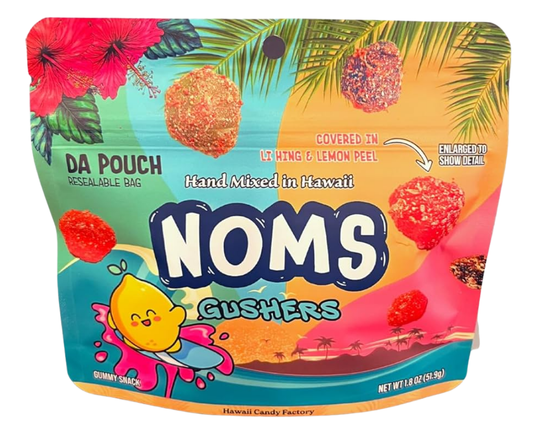 Noms (often stylized as NOMS or Noms Gushers) are a popular brand of Hawaiian-style, hand-mixed gummy candies produced by the Hawaii Candy Factory. They are characterized by a sweet, sour, and salty flavor profile, typically featuring gummy candies (like Gushers, peach rings, or worms) coated in savory li hing mui (dried plum) powder and zesty lemon peel.